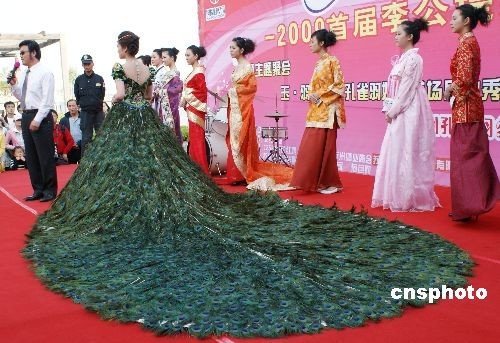 图文:999.9万天价孔雀羽婚纱亮相苏州